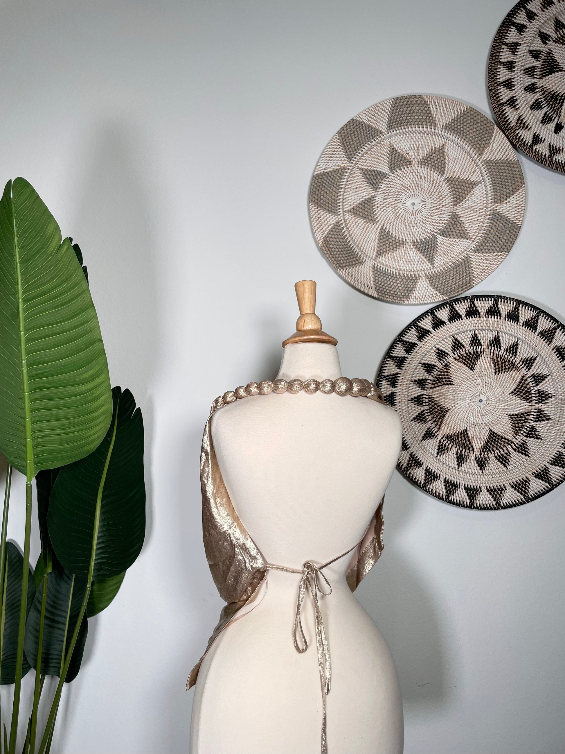 Champagne gold color, beaded neck statement design, open back with rope. Runs normal. No stretch.