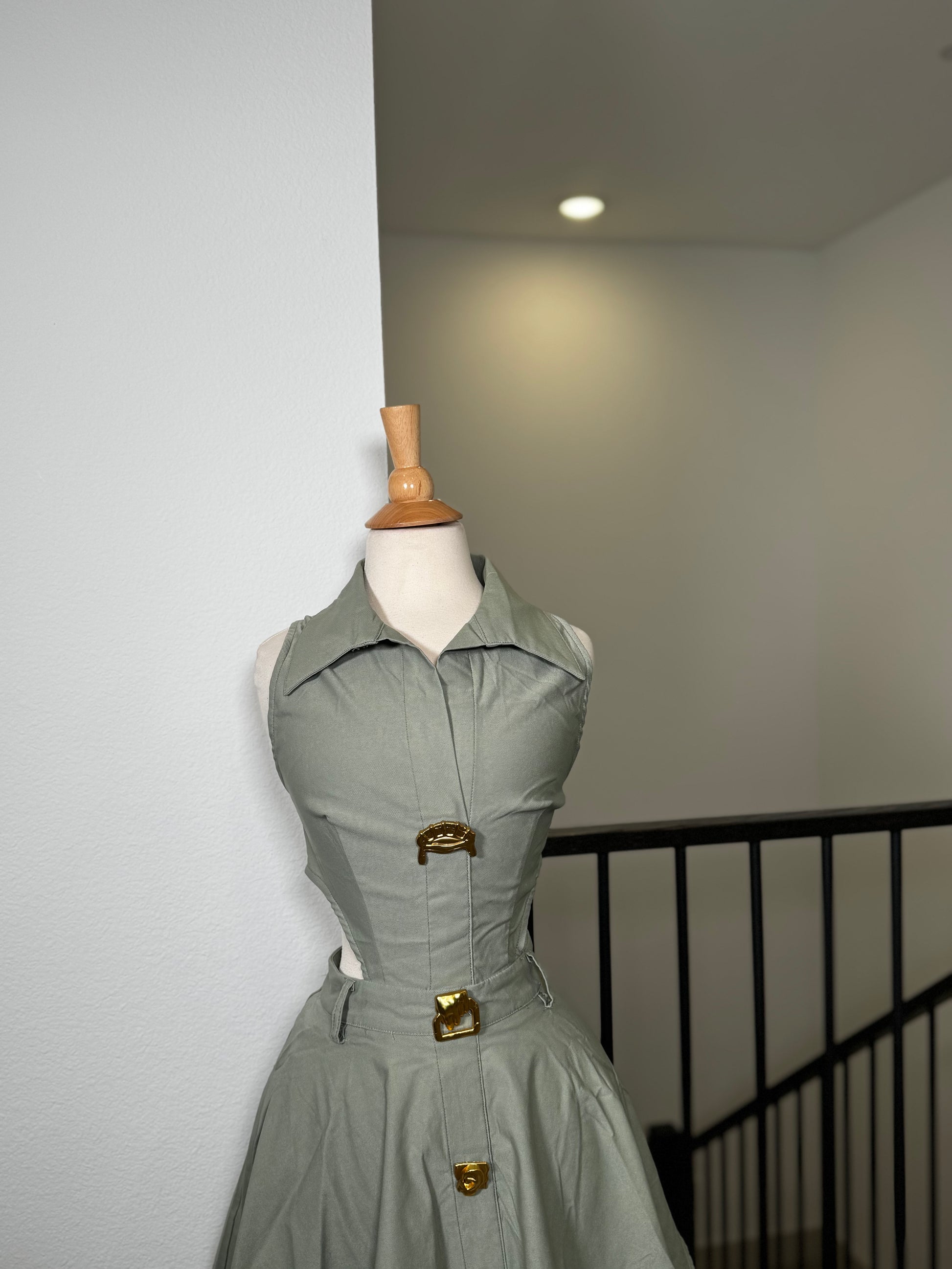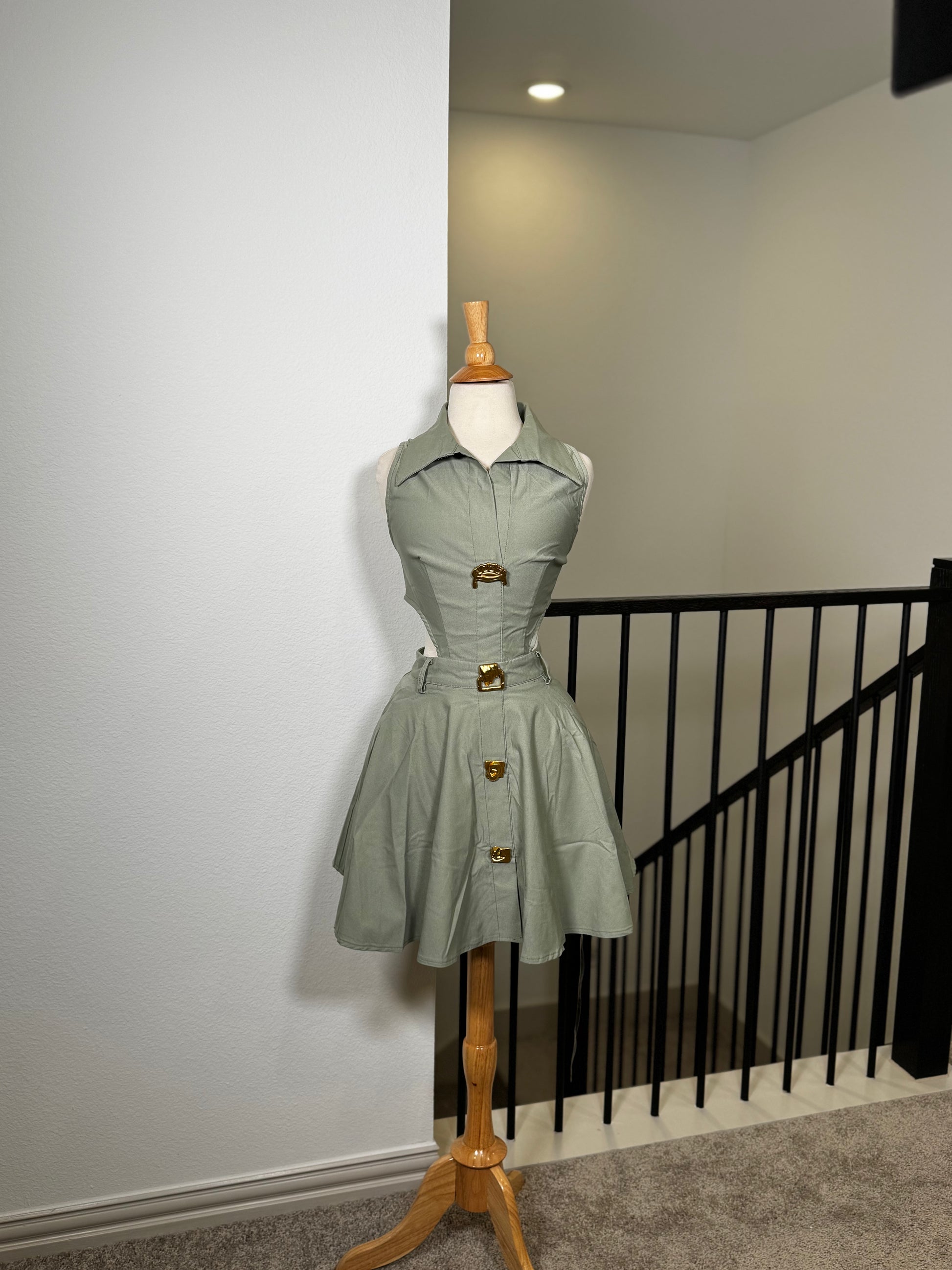 This structured mini boasts a confident button down a defined empire waist, and a playful flared skirt that creates an instantly knowing silhouette. The gold detail adds a refined touch, ensuring every detail speaks to an elevated aesthetic. Complete your look with sleek pointed toe heels or dress down with stylish boots.