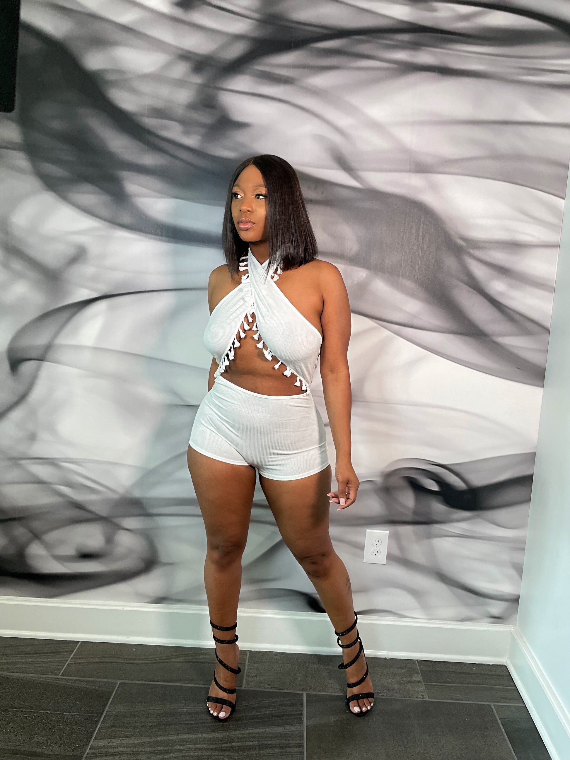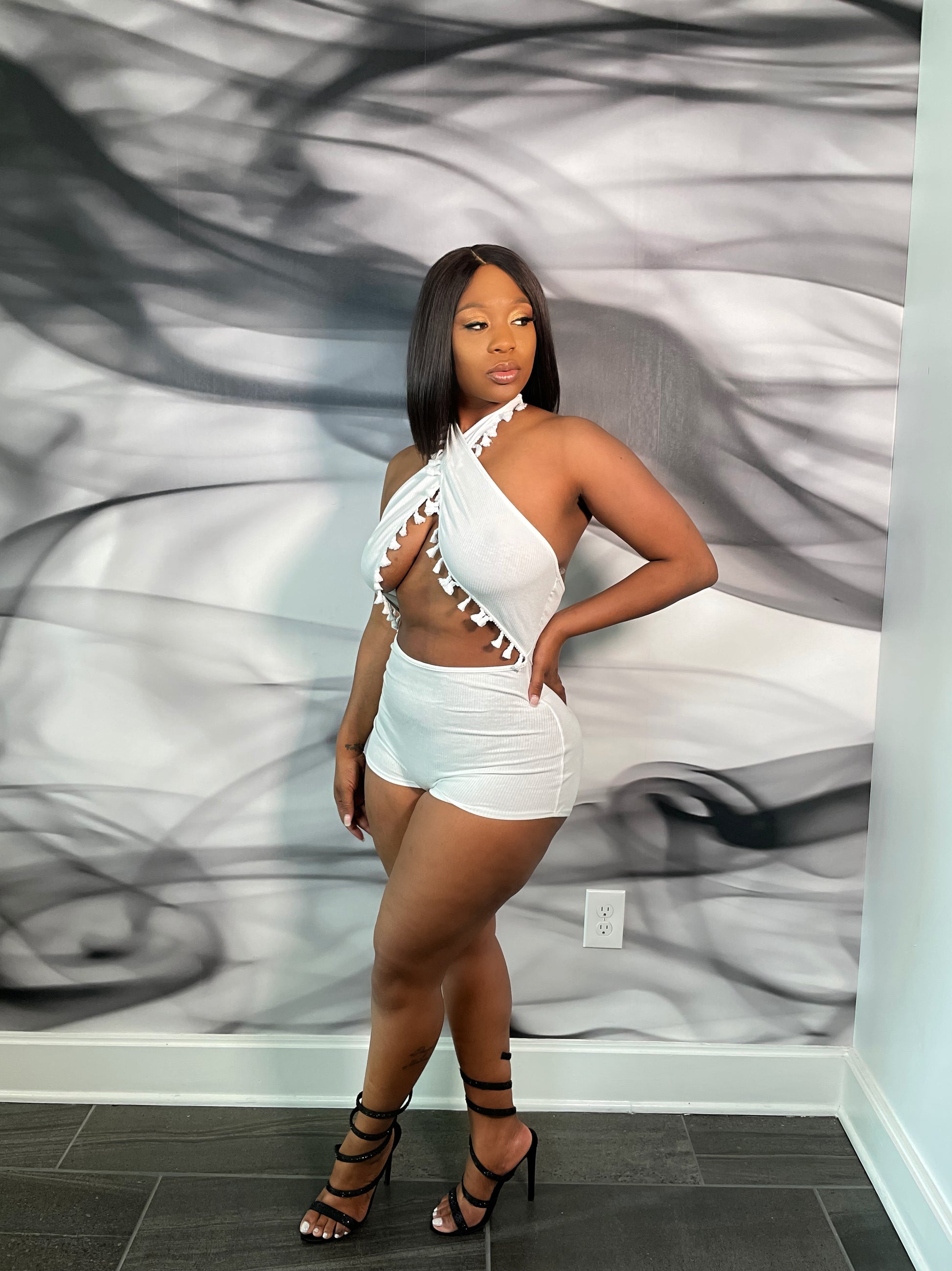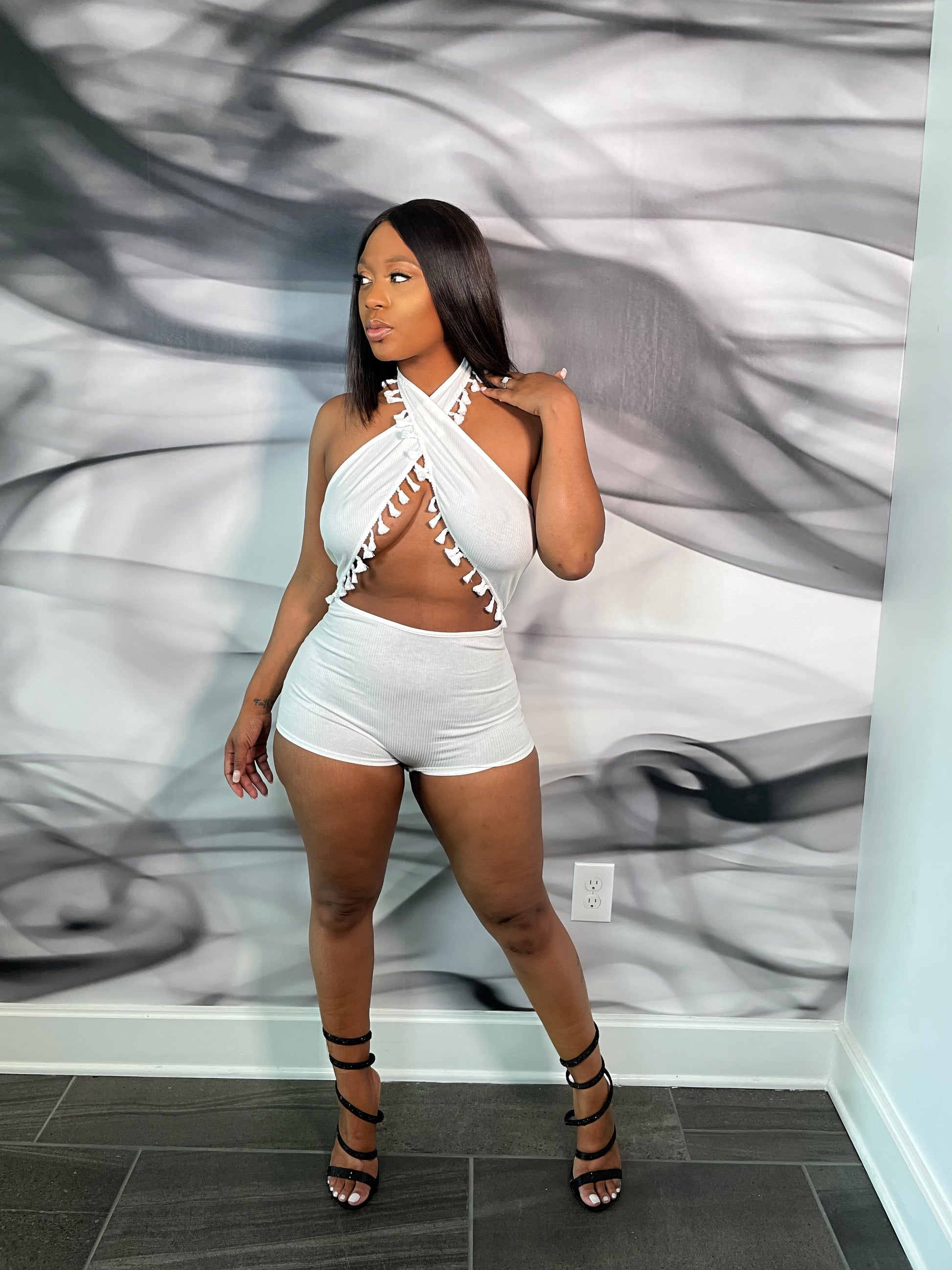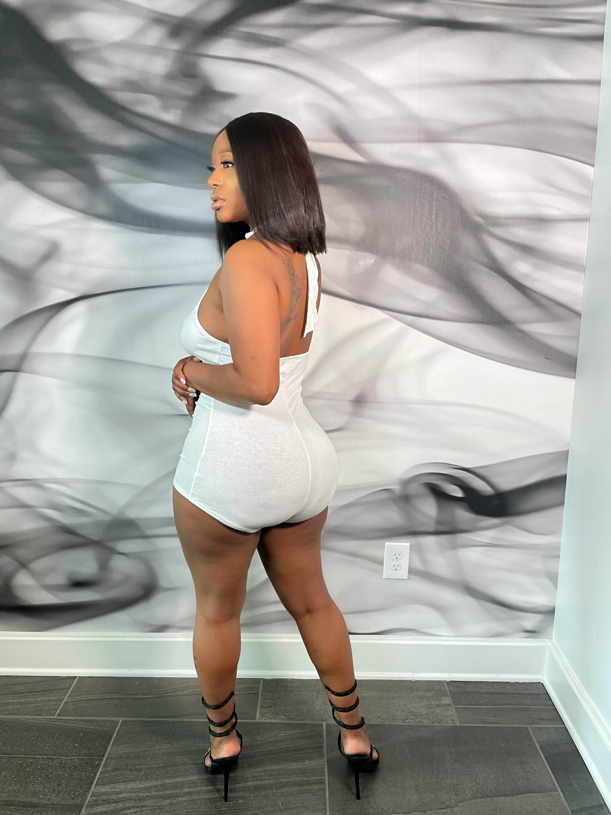 This playsuit is sure to give your look a serious update. Featuring a white stretch material with a halterneck design. Team this with heels and gold accessories to complete the look.