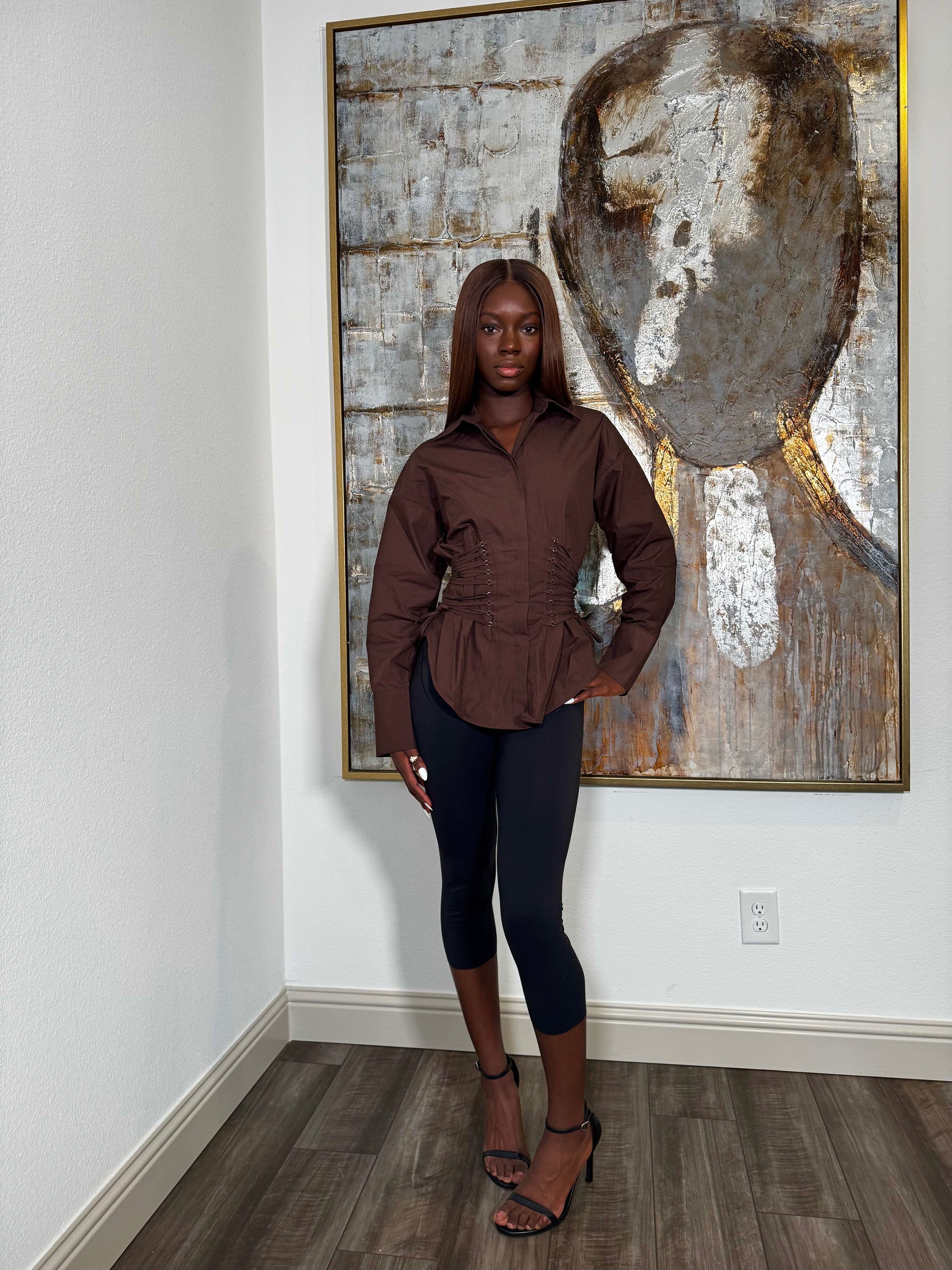 Own your power in this audacious Waistline Corset Blouse. Rich brown fabric meets fearless design with corset down the sides, sculpting your silhouette with unapologetic confidence. This isn't just a blouse—it's a statement. The structured corset detailing commands attention while delivering a flattering, defined waistline that demands to be seen. Bold, sexy, and uncompromising, this piece is for those who refuse to blend in. Wear it like you mean it.